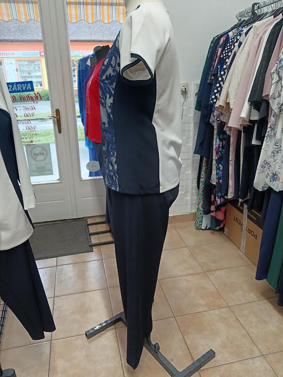 Nadrág: gumis magasított derekú, egyenes szárú, sötétkék színű.