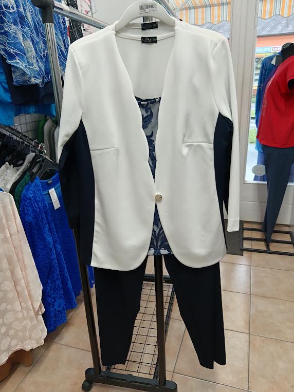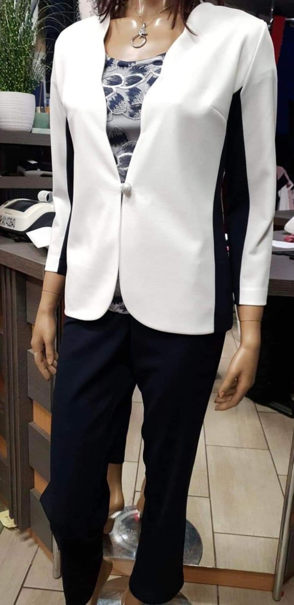 Blézer: karcsúsított fazon, hosszú ujjú, elöl egy gombbal zárható, sötétkék-ekrü szín.