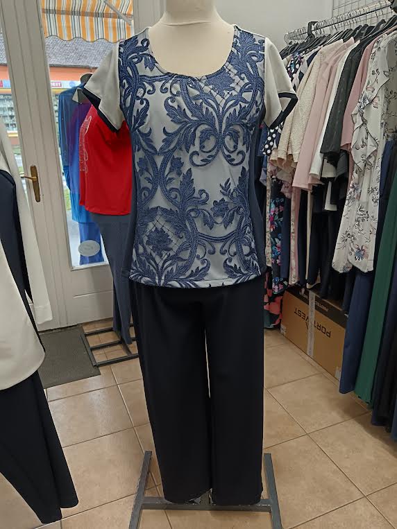 Top: karcsúsított fazon, eleje csipkebetéttel, háta egyszínű, rövid ujjú, testhez álló, sötétkék-ekrü szín.